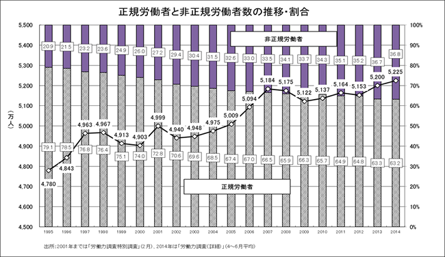 しかしながら、近年増加している非正規労働者は、不安定な身分であり、十分な教育・訓練も受けられず、賃金も低いままである。正規社員で就職したくても就職できないいわゆる「不本意非正規労働者」は3人に一人を占め、低収入で結婚できない若者も増えている。また、結婚しても、十分な収入がないため、子どもを産み、育てることをあきらめたり、十分な教育を受けさせることができない家庭も増加している。