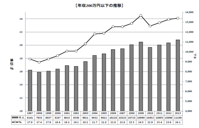 特に非正規労働者の賃金は、正規労働者に比べて低く、厳しい生活を余儀なくされている。非正規労働者の8割以上が年収300万円未満となっており、さらに年収200万円以下のいわゆるワーキングプアといわれる労働者も近年大幅に増加している(図表2)。