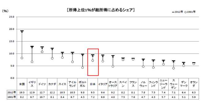 そして非正規労働者の増加とともに、日本では格差が急速に拡大している。1981年に7.2%であった所得上位者1%が総所得に占めるシェアは、2012年には9.5%と大幅に増加している(図表3)。また、所得格差を示す指標であるジニ係数7においても、この20年の間に格差が広がっていることが明らかになっている。