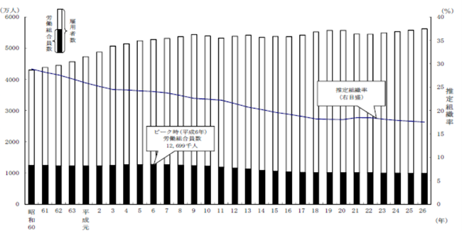 組合員数低下の原因は、非正規労働者の増加や産業構造の変化等の要因が考えられている。1990年代以降グローバリズムが進展し、「規制改革」「構造改革」が推し進められ、日本型の終身雇用、年功序列制度が崩壊し、派遣や請負、パートなど非正規労働者が増加した。また、産業構造の変化により、製造業の事業拠点の海外移転などが進められ、正規社員が大幅に減少した。それに伴い、正規社員を中心に組織してきた日本の労働組合の組合員数は低下を続けたのである。