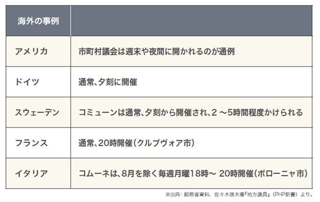 欧米各国の地方議会は、土日や夜間に開催がされており、普通の人が仕事をしながら議員になることが当たり前である。しかも報酬は低額か無償であり、あくまでボランティア活動のような感覚であり、選挙運動にすらお金がかかっていないのである。