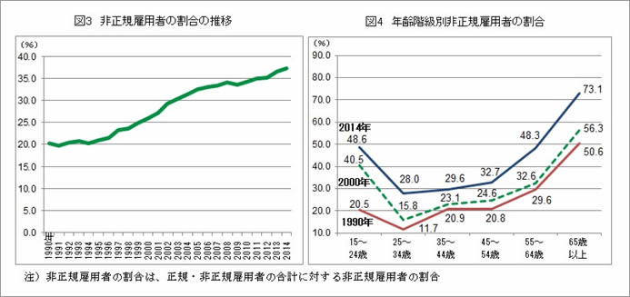 総務省統計局によると、図1にある通り、全ての労働者のうち、非正規雇用の占める割合は、1990年の20.2%から2014年には37.4%へと2倍近く上昇した。年齢階級別にみても、全ての年齢階級で1990年より2000年、2000年よりも2014年で非正規雇用の割合が高く、15~24歳の若年層では、1990年に比べ2014年は28.1ポイント上昇し、実に48.6%と2人に1人が非正規で、全年齢階級の中で最大の上昇幅となっている。1
