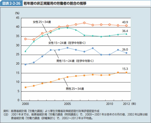 次に若年層の非正規化について『2013年版厚生労働白書 -若者の意識を探る- 』2のデータを用いて詳しく見てみる。図2は、若年層の非正規雇用の労働者の割合の推移を示したものである。若年層の非正規化の中心を占めているのは女性であることがわかる。男性に関しては、15~24歳の方が、25~34歳の層より非正規率が高く、後者の非正規率はわずか15%だ。
