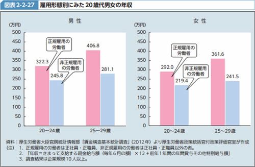 次に、非正規の彼女/彼らの年収生活をみてみる。図3は、雇用形態別にみた20歳代の男女の年収が、非正規・正規でどの程度違うのかを示したものだ。この図からわかるとおり、20代の非正規労働者は年収300万円に満たない。さらに言うと、女性は正規雇用の労働者であっても24歳未満の場合、年収は300万円以下である。