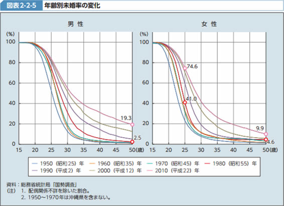女性は配偶者がいる場合があるから、年収が低くてもしかたない/大丈夫、という考え方が根強く残っている。本稿を見ている方も「女性は結婚しているから大丈夫なのでは」と思われているかもしれない。データ上はどうだろうか。図4は年齢別未婚率の変化を示したものだが、これでみると2010年の25歳時点の未婚率は実に75%弱、30歳時点でも40%以上が未婚であることがわかる。つまり30歳以下の女性の殆どは年収300万円以下の生活で自立することを余儀なくされているのだ。