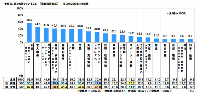 注目したいのは、全体比+となっている女性の「お金」62.8%、「将来」45.4%、「恋愛」44.6%だ。この結果から、女性は買い物好きだからお金の心配ばかりして将来は三食昼寝付きになることを夢見て恋愛に夢中になっている、とするのは完全なミスリードだ。前項でみたとおり、この層の女性こそが、非正規で働き年収300万円以下の生活をしているからだ。そしてその苦しい生活から脱却するためには結婚するしかない、その入り口として「恋愛」に関心がいっているのだとすれば、人生の選択肢に経済的バイアスが強くかかっていると言えないか。