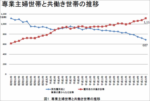 現在、仕事内容や雇用形態、家族のあり方は目まぐるしく加速度的に変化しているように私には映ります。戦後の日本の働き方は一家の主となる男性が会社で働き、妻である女性は専業主婦として子どもを産み育て、地域で活動していました。それが現在では、共働き世帯が専業主婦世帯の倍近くになるまで増えてきています。