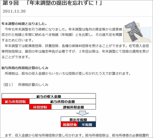連載の始まりは、労働組合のホームページに「ろうきんコラム」を載せたことでした。コラム連載は2011年1月から2012年6月までで、可処分所得や生涯賃金の考え方や、ちょっと得する税金や保険の話を掲載しました。(図2)は年末調整の簡単な仕組みとちょっと得する申請方法を掲載したコラムからの抜粋です。いつもは辛口である組合員からの評判が良かったためお示ししました。