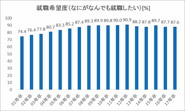 マイナビの2017年卒学生を対象に行った調査[1]では「なにがなんでも就職したい」と87.6%が回答した。2001年卒は74.4%であったのが徐々に増加していき90%「程度で安定している(図1)。図1からは就職に対する焦りと執着を感じる大学生の姿が想像される。その結果、時間に追われる形で強引に決めた就職先とのミスマッチに悩むことも多く、厚生労働省の調査[2]は平成24年3月新規大学卒業者が3年以内に離職した比率は32.3%に達すると報告している(図2)。また、離職する人の理由としては体力的限界などのやむを得ない理由がある一方で「思い描いた仕事と違う」や「社風が合わない」といったミスマッチによるものも挙げられる。これらは就職までに時間をかけて企業分析やOB訪問を行えばある程度は解決できるものでもあるが現状の制度では時間的にも難しいところがあり、やはり働いて現場に行ってみないとわからないこともあるのが実情だ。