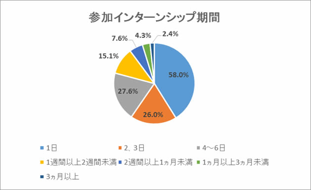 近年、就職前の企業理解を目的としたインターンを実施する企業は増加傾向にある。2016年卒学生を対象に実施されたマイナビのライフスタイル調査[3]では全体の55.8%の学生がインターンシップに「参加した」と回答した。参加した社数は1社が47.5%、2社が24.6%、3社が13.2%という結果だった。また、参加時期は2014年8月が51.0%、同年9月が37.8%であり、ほとんどが卒業前年度の夏季休暇中に参加したことが分かる。期間は58.0%が1日であった。3か月以上は2.4%に留まる結果だった(図3)。期間としては1週間未満がほとんどであり社風と自分の合致を測るには短期間すぎるために不十分であると考えられる。インターンの形式に注目すると学生だけで行うグループワークや座学で終わってしまうケースも多く、現場を知る機会としては不十分と言える。現在のインターンは企業の広報活動の一環として行われており、多くの学生に参加を認めているために負担も大きいし、インターン参加者全員を現場に派遣するのは現場の負担も大きくなるため実現が難しい。