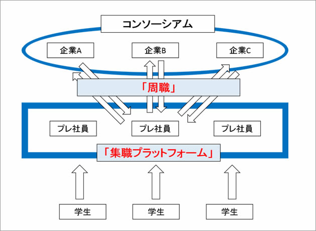 同じ業界に属する複数社が集まってコンソーシアムを形成する。例えば消費財メーカーであれば消費財を製造販売する企業が集まって消費財コンソーシアムをつくる。新卒採用はこのコンソーシアムを単位にして行う。例えば消費財コンソーシアムで1000名採用、自動車コンソーシアムで2000名採用という形で採用するということである。大学卒業後にはこのコンソーシアムが提供する「集職プラットフォーム」で「プレ社員」として研修を積む。コンソーシアム参画企業が共同で研修のための場所などを準備して集職プラットフォームの拠点を準備する。そこで名刺の渡し方やメールの仕方、営業時のマナーやシミュレーションなどの初歩的なところはどの企業も関係なく習得する必要があり、合同で行うことで研修の効率化とそれに伴うコストカットも可能になると考えられる。また、同業界でコンソーシアムを組んでいる場合、その業界特有の法的な規制や現在のトレンド、これまでの業界の動向も共通して教育することが可能であり業界人の仲間入りをする基礎固めをすることができる。技術職や研究職であれば企業での研究の意義や基本的な取り組み方、プロジェクトの進め方などを合同で行うことができ、標準化したルールや方針をこの段階で共通して教えておくことができるので共同研究を行うことになった際にはスムーズに進めることが可能になると推測される。