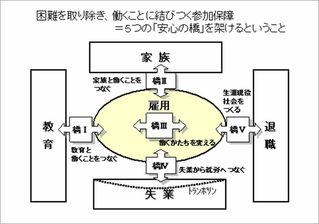連合[5]は、「連合はすべての働くものの拠りどころとして、その力を結集し、働くことを軸とする安心社会を築くために全力をあげる」と宣言している。また、「すべての労働者とは、正規、非正規、あるいは組合員、非組合員を問わないすべての現役の労働者であるが、労働の第一線から退いた退職者、これから労働の世界に入ろうとする子どもたち、そして労働者の家族も含めば、日本の国民のなかの圧倒的多数派である」としており、働きはじめる第一歩、あるいはその準備である入社初期や就職活動は重要な位置づけにあると言える。また、本稿で提案した周職制度の導入は連合が目標としている「安心の橋」を架けることに相当する。教育と働くことをつなぐ橋Ⅰの役割をより強く果たすことが可能になると思われる。また、ミスマッチによる失業を防ぐことにつながり橋Ⅳの役割も果たすことが期待される。