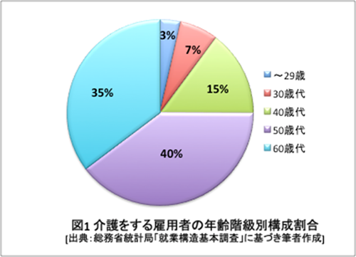 総務省統計局(2013)の調査によると、介護をしている雇用者は239万9千人である(※⑥)。年齢階級別構成割合を見ると、40歳代から60歳代が全体の8割以上を占めている。この年代は社内において課長や部長クラスの役職を任され、経験も豊富なため重要なポジションに就くことも多い。これまでは家庭内での介護の役割は主に専業主婦の女性が担っていたが(※①)、女性も社会に進出するようになり、合わせて少子化や核家族化が進んだため、性別や子・兄弟等の立場に関わらず、介護を担うようになっている。