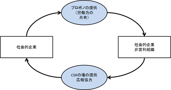 それでは、プロボノ制度をいかに企業や組織で活用するかについて記載したいと思う。まず、プロボノになるための制度つくりが組織や団体内で必要になる。先述の通り、プロボノ制度は既に組織に属している人が活用する制度であるため、属している組織と受け入れる組織の両社でのプロボノ契約が必要になる。ここで重要なのが、両者にとってwin-winなプロボノ契約が必要になる。プロボノを受け入れる組織としては、労働力不足のため活動に賛同して協力する人材を必要としているが、プロボノを出す組織としてはむしろ労働力を流出させてしまうのではないかという危惧もあるかと思われる。そのため、このプロボノ契約では業務の時間や期間を決めておく必要がある。たとえば、日々出社をしている人に対しては業後のみプロボノが可能、或いは週に1日~2日間のみプロボノとして活動することが可能、といった時間や期間の決め方がありうる。また、プロボノを出す組織としては、契約をする動機の一つとしてCSR活動をしていると対外発進する機会を得るためである。昨今、民間企業はただ商業活動を行うだけでなく、顧客や消費者の信頼を得るためにCSRの一環として社会貢献活動を行っている。プロボノ契約もその一つにあたり、組織の人員をプロボノとして出すわけなので、単に資金提供をするよりも効果的に社会貢献活動を行うことができる。そのため、プロボノ契約時にはCSRの広報に組織間で協力することも記載しておくと良い。例えば、プロボノが活躍している写真などを企業のホームページに掲載する承諾をもらうなどが挙げられる。こうした関係を図で表すと以下のようになる。