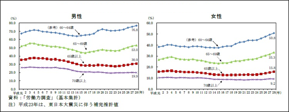図2 男女別高齢者の就業率の推移(平成元年~28年)