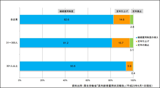 そんな中、日本における高齢者の雇用は高齢化と共に増加しており、2006年の改正高年齢者雇用安定法2)の施行以降、各企業は①定年制の廃止、②定年の延長、③継続雇用制度のいずれかを選択することが義務となったこともあり、60歳~69歳で働く人口は着実に増えている(図2)。中でも特に③継続雇用制度を選択した企業が多く、60歳の定年を迎えた後も65歳まで働ける企業が半数近くを占めている(図3・4)。