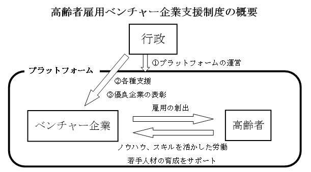 ベンチャー企業は、設立後の年数、平均年齢、社員数などで一定の上限を設け、基準をクリアする駆け出しの企業を支援制度の対象とする。今回ベンチャー企業という括りにしているのは、高齢者にとって柔軟な働き方が出来て、かつ高齢者雇用の潜在ニーズがあり、採用プロセスの単純さや、若い社員が多いことなどを、実現性を担保する要素として重視したためである。