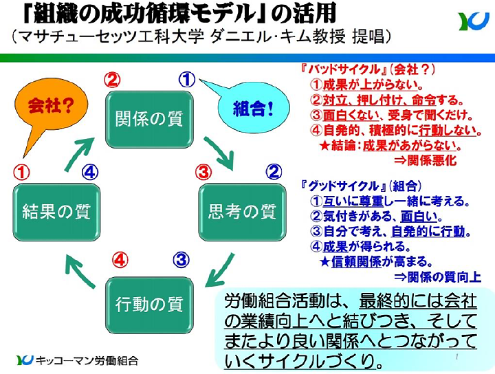 「組織の成功循環モデル(*2)」というのは「『関係の質→思考の質→行動の質→結果の質』がグルグル好循環していく」というダニエル・キム氏の理論だ。私たちは、この「組織の成功循環モデル」に基づき、当労組におけるあるべき職場像を模索してきた。