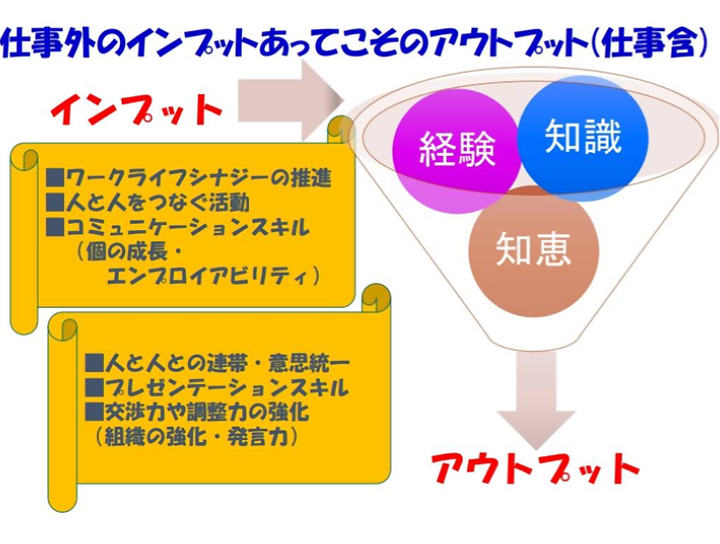 私は、労働組合における活動や経験もインプット増加に寄与できると考える。例えば、「考えの異なる職場の主張を総意化して臨む経営層との交渉経験」「単組活動や対外活動による社内外の情報獲得や人脈拡大」「政策制度実現や労働者自主福祉運動への貢献に伴う社会性の醸成」などは、創造力を増しイノベーションを生み出すうえでも、仕事を効率的に進めるうえでも、経験者のエンプロイアビリティを押し上げるだろう。