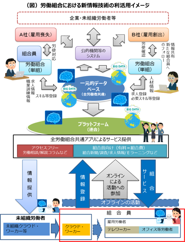 なお、前項1.の一元的データベースの活用と合わせて、労働組合における新情報技術の利活用イメージは上図(著者作成)のとおり。