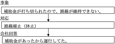 補助金に頼った路線では、「自治体からの依頼で運行している。(運行してやってる。)」というような意識を持っているようである。補助金が打ち切られたので、路線廃止もやむ負えない。というのではなく、「補助金が出るということは、自治体から運行のチャンスを与えられた!」、自分たちで路線を維持しよう。という考えを持つべきである。