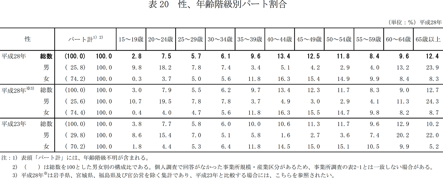 - 「平成28年パートタイム労働者総合実態調査の概況」(厚生労働省)の結果の概要(個人調査)内の「Ⅰ パートの状況 (1)属性」より。(https://www.mhlw.go.jp/toukei/itiran/roudou/koyou/keitai/16/dl/kojin1-1.pdf 閲覧日:2020年7月23日)