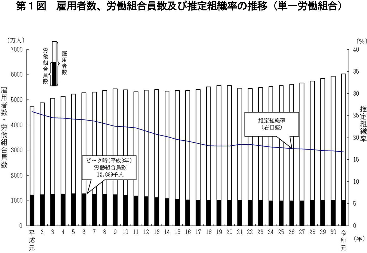 出典:厚生労働省「令和元年(2019年)労働組合基礎調査の概況」p.3の「第1図 雇用者数、労働組合員数及び推定組織率の推移(単一労働組合)」より。