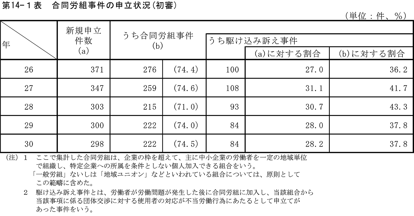 出典:中央労働委員会による「年報概要」(平成30年)の「第1編 一般企業関係審査・調整等の概要 第1章 不当労働行為の審査 第1節不当労働行為審査の概況」のp.18より「第14-1表 合同労組事件の申立状況(初審)」(https://www.mhlw.go.jp/churoi/nenpou/dl/h30/1-1-1.pdf 閲覧日:2020年7月23日)