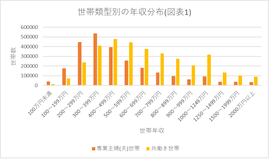 総務省統計局による家計調査報告書(2021)によると、世帯主が夫である共働き世帯の月当たり収入平均は約60万円となっている。ここから共働き世帯での平均年収は約720万円と推計できる。しかし、一部の高収入世帯が平均世帯所得を押し上げている可能性があるため、最新の就業構造基本調査を用いて共働き世帯、専業主婦(夫)世帯の年収分布を探る。以下のグラフ(図表1)は平成29年度の就業構造基本調査をもとに、夫婦のみの共働き世帯、専業主婦(夫)世帯の世帯収入の分布を表したものである(8)。