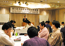 経営分析の手法を学び、財務諸表がわかる活動家の養成を目的に、2000年より開催している「中小企業経営分析講座」、第5回目になる今回は東海ブロック連絡会(連合愛知)の協力により、23名の参加を得て10月18日~19日名古屋で開催した。(参加者名裏面参照) 講義1では、UIゼンセン同盟静岡支部林憲治次長より、合理化対策の事例から経営分析の必要性について、講義2「労働組合のための経営分析」では、板橋正博経済経営分析センター代表より、シュミレーションゲームをつかった初心者でもわかる基本的な財務諸表の読み方を理解し、労働組合の経営対策資料として使いこなす力を身につけた。
