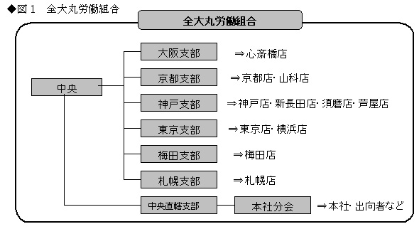 さて、大丸グループでは、ほとんどの各グループ企業に企業別労働組合が存在しており、大丸グループ労連は全部で9単組から構成されています。組合員数は約8,800名です。その中で、全大丸労働組合には、中央執行部のもとに7つの支部(大阪、京都、神戸、東京、梅田、札幌各支部および中央直轄支部本社分会)が存在しています(図1参照)。組合員数は約5,500名、うち約2,000名は非正規社員です。