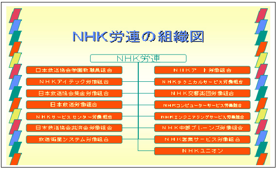NHK労連には、NHKで働く職員でつくる労働組合である日本放送労働組合(以下、日放労)とNHKの13の関連団体の労働組合が加盟しています。また、NHKユニオンというパート・アルバイトの方などが加入している組合があり、全部で15の組織で構成されています。