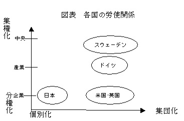 労使関係の特徴を理解するための分析枠組みは二つあります。一つは、共通規則を何処で決定するのか、という視点があります。共通規則を全国レベルで決めるのか、産業レベルで決めるのか、企業レベルで決めるのか、それとも職場レベルで決めるのか、この点に各国の労使関係の違いが現れます。全国レベルで決めるとすればその労使関係は、非常に集権的(centralization)な労使関係といえます。逆に、企業や職場レベルで決まっているとすれば、分権的(decentralization)と言えます。次に、二つめの分析枠組みは、賃金が個別で決められるのか(個別化)、それとも集団で決められるのか(集団化)という視点であります。