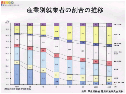 図1は産業別就業者の割合の推移を表しています。図1から、近年我が国において、製造業や建設業などでは雇用労働者が減少しており、逆にサービス業や小売、飲食店などの第三次産業の就業者数が増えてきていることがはっきりとわかります。