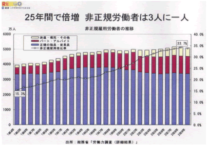 日本の労働者人口は2008年では6636万人であり、うち雇用者数は5535万人で、労働者人口の8割以上が雇用者ということになります。すなわち、日本は雇用社会だといえます。ところが近年、雇用に大きな変化が起こっています。