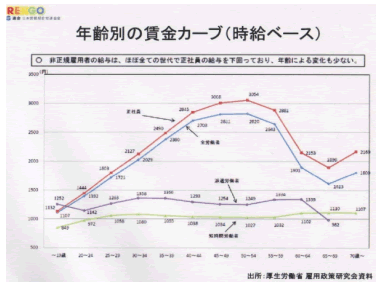 雇用の変化に伴い、賃金においても変化が起こっています。図3は年齢別の賃金カーブを表しているグラフです。この図から、非正規雇用者の給与は、ほぼ全ての世代で正社員の給与を下回っており、年齢による変化も少ないことがわかります。すなわち、派遣や契約社員などの非正規雇用労働者の賃金は極めて安く低位でて、彼らの生活は厳しい状況にあります。雇用の質の劣化によって、年収200万円以下の労働者は近年どんどん増加しています。