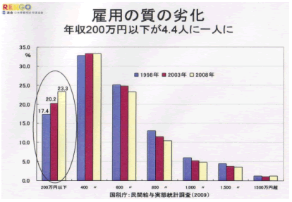 図4は国税庁が2009年に実施されした民間給与実態統計調査の結果です。我が国において、年収200万円以下の労働者の割合は、すでに4.4人に1人という高い水準となっており、いわゆる「ワーキングプア」問題となっています。