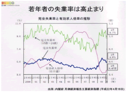 図5は、内閣府が今年の4月16日に発表した月例経済報告主要経済指標の一つ、完全失業率と有効求人倍率の推移を表しているグラフです。ここで注目すべきなのは、15歳から24歳の完全失業率です。2000年から現在までずっと高い水準で推移しています。2005年から2007年までの間には若干の改善が見えましたが、2008年から急に高い水準に戻っています。そして社会全体の完全失業率も、2002年と2009年とも高い水準に達していましたが、2002年の上り方は少しずつ悪化したのに対して、15歳から24歳は2009年は急激に悪化しました。