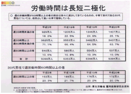 また、図6は労働時間の状況をあらわしているもの表です。週の労働時間が60時間以上の方の割合は徐々に減少してきているものの、子育て世代である30代男性については、依然として20%以上といった高い水準で推移していることがわかります。要するに現在、我が国では5人に一人が週60時間以上働いているということです。これは過労死の大きな要因であり、「ワーク・ライフ・バランス」を阻害しているといえます。