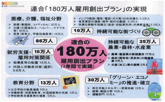 連合の政策について、まず、「180万人雇用創出プラン」を紹介します。図7は連合がこれから実現をめざしている「180万人雇用創出プラン」をあらわしている図です。雇用創出とは、雇用を新たに生み出すことであり、この「180万人雇用創出プラン」を通じて、連合は180万の労働者に新たな就業・就職させるの機会を与えようと考えています。例えば医療、介護、福祉分野においては86万人、就労支援・雇用対策関係においては16万人、そして教育分野においては13万人、継続可能な街づくりには10万人、継続可能な農業・森林・水産業には25万人、そして「グリーン・エコノミー」の推進と確立においては30万人、合わせて180万人の雇用を創出したいと考えています。