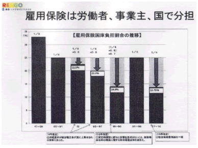 具体的な取組事例としては、雇用保険の安定的な運営があります。連合は雇用のデーフティネットとしての雇用保険制度の整備を重視しています。雇用保険制度とは、労働者が失業した際の生活の安定と早期再就職の促進を実現するために、労使の保険料と国の負担金によって給付をおこなう制度であり、セーフティネットの機能を持っています。雇用労働者にとって最も大きなリスクは失業です。我が国は雇用社会であるため、雇用保険制度を安定的に運営する必要性が極めて高いのです。図8は雇用保険の国庫負担割合の推移を示した図です。1947~1959年には国庫負担分は3分の1となっていましたが、徐々に減ってきて、現在では国は法律で定められた4分の1を下回る水準しか負担していません。連合としてはなるべく早く43分の1に戻すべきである、という考え方を持っています。民主党政権を通じて早く実現したいと思っていますが、予算との関連で、難航するかもしれません。