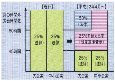 他の事例としては、労働基準法の改正で、ワークルールの再整理の一環です。今回の労働基準法の改正を通じて、時間外労働の割増賃金率は月50時間超については25%から50%へ引き上げられました。この改正労働基準法はすでに4月1日から施行されています(図9)。