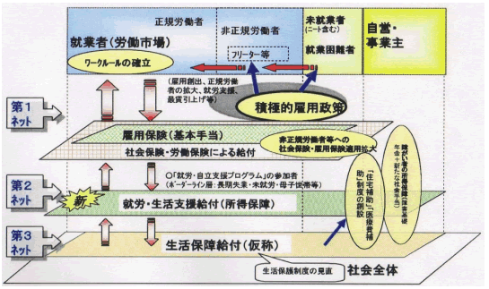また、もうひとつの事例として、社会的セーフティネットについて説明します。連合は「三層構造による社会的セーフティネット」という構想を持っています(図10)。現行の社会的セーフティネットには、図の中の第1ネット(雇用保険)と第3ネット(生活保護)しかありません。雇用労働者は失業してしまうと、まず、第1ネットの雇用保険によって最低90日間の失業手当の給付がおこなわれます。つまり、社会保険や公的な労働保険による給付があるということです。しかし、この90日間の給付が切れてしまうと、そのまま第3ネットの生活保障給付の対象となってしまうのです。連合が現在考えている社会的セーフティネットは、第1ネットと第3ネットの間に、第2ネットを作ることです。第2ネットとは、職を失った雇用保険が切れた求職者の方に月10~12万円の就労・生活支援給付を支給しながら、教育訓練を受けさせるなどを通じて支援し、なるべく早く再就業・再就職していただくことです。