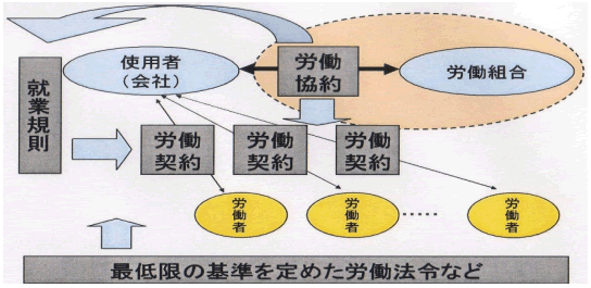 皆さんが企業に就職されたときは、必ず「労働契約」、「就業規則」、「労働協約」などの言葉に出会うと思います。労働契約とは、労働者が労務の提供をおこなうことを約し、使用者がその対価としての賃金を支払うことを約する契約のことを指します。次に、就業規則とは、労働条件を公平・統一的に設定し、かつ、職場規律を規則として明定するため使用者が定める職場規律や労働条件に関する規則類です。また、労働協約とは、労使が団体交渉によって取り決めた労働条件やその他の事項を書面に作成し、両当事者が署名又は記名押印したものを指します。