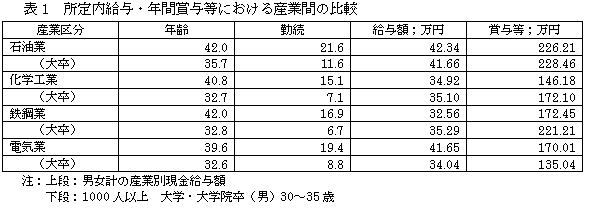 石油産業は製造業に分類されますが、労使交渉における目標水準は、多国籍企業であるエクソンモービルやシェル、商社ならびに電力会社に置いてきた経緯にあり、結果として相応に高い水準にあると言えます。表1は厚生労働省が発行した平成21年版の賃金センサスの資料「所定内給与・年間賞与等における産業間の比較」です。この資料を見ますと、石油業における給与額と賞与額は、両方とも比較的高い水準となっていることが分かります。
