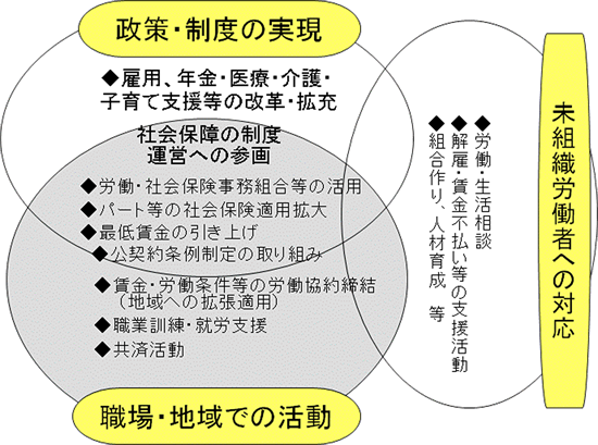 このように、組合の活動は、大きく、「職場・地域での活動」と「政策活動」の2つに分けられます。また、近年、「未組織労働者への対応」も、組合にとっての重要な活動領域となっています。