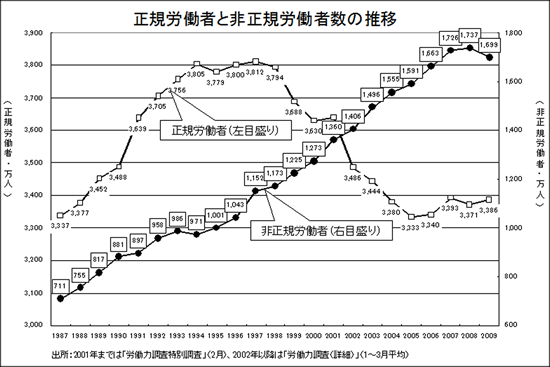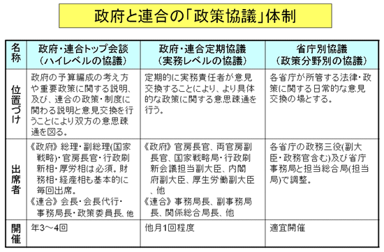 詳しくは触れませんが、こうした政策協定の締結や政策協議体制の構築の結果、連合の提言の多くが、2010年度の政府予算に反映されました。また、今年の6月、政労使で新成長戦略の中に盛り込む「雇用・人材戦略」が作成されました *2 。ここで、決めたことを絵に画いた餅で終わらせないようにすることが今後の課題です。