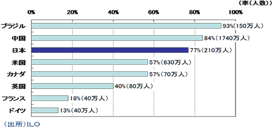 それにくわえて、失業率も現在5%程度の高い水準を維持しています(図表4)。また、日本は、失業保険の給付を受けていない失業者が、失業者全体の8割近くに上ります(図表5)。