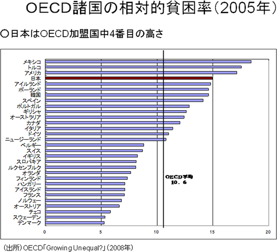 先ほど、非正規社員の賃金は、正規社員と比べると非常に低いことを述べましたが、それを反映してか、年収200万円以下の層が年々増加しています(図表6)。くわえて、生活保護世帯も年々増加しています(図表7)。その結果、国際的に見た場合、日本の相対的貧困率 *1 は非常に高いものとなっています(図表8・9)。