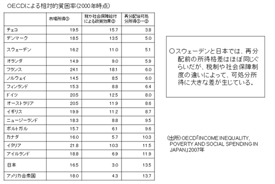 ただ、ここで注目して欲しいのは、図表9が示している通り、市場所得、つまり、課税前の所得で見てみますと、日本とデンマーク・スウェーデンの相対的貧困率に、それほど差があるわけではありません。ところが、税や社会保障による所得の再分配が行われた後になると、これらの国と日本の貧困率は大きく異なったものになります。このことから、日本の税制度や社会保障制度は所得の再分配機能が極めて弱いことが、お分かりいただけるかと思います。